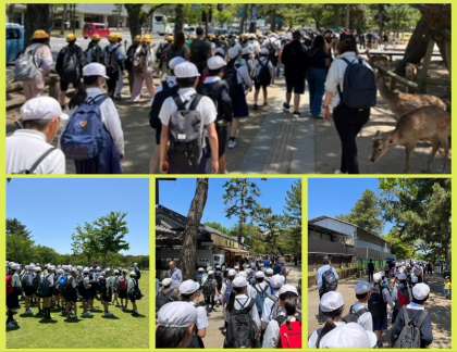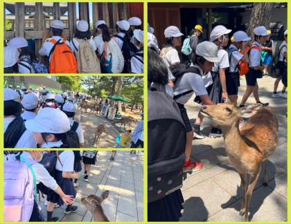 そして、奈良公園といえば鹿ですね。初めて行った児童は、道を歩いている鹿に驚いたのではないでしょうか?!初めてだと少し怖いかもしれませんが、慣れてくると可愛いですね。道行く鹿を撫でている児童もいます^^