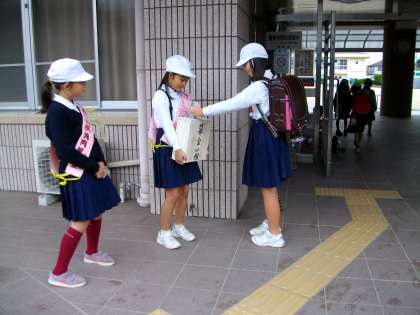 児童会の活動の一環として、赤い羽根の共同募金に参加しています。