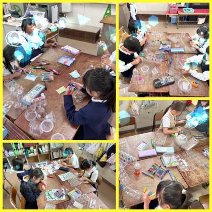 2年2組では、図工をしていました。透明な容器や袋に、ペンで色をつけていきます。光を容器に通すときれいな色や模様がでてくそうです。みんなとても楽しそうに色を塗っていました。完成が楽しみですね。