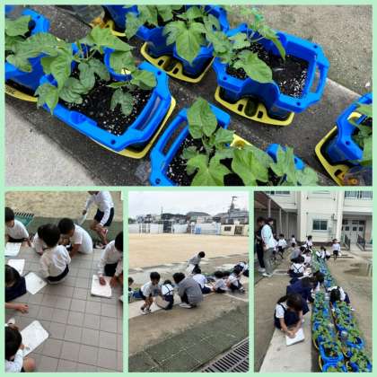 今日は、成長してきたアサガオの様子を絵に描いて記録しました。