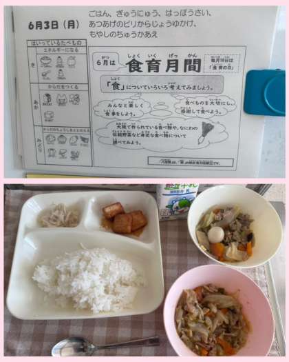 6月は食育月間です。毎日の食事に感謝をしたり、自分たちの住んでいる地域で作られている食べ物について興味をもってみたりなど、食について考えてみることができるといいですね。ぜひご家庭でも食について話し合ってみてください。