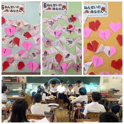給食の配膳や掃除の仕方を教えてくれたり、休み時間に一緒に遊んでもらったりと、いつも優しくしてくれる6年生に、1年生から素敵な贈り物が届きました。