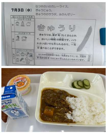 今日はカレーライスです。ピーマンやナスなど夏野菜がたっぷり入っていて栄養満点です。