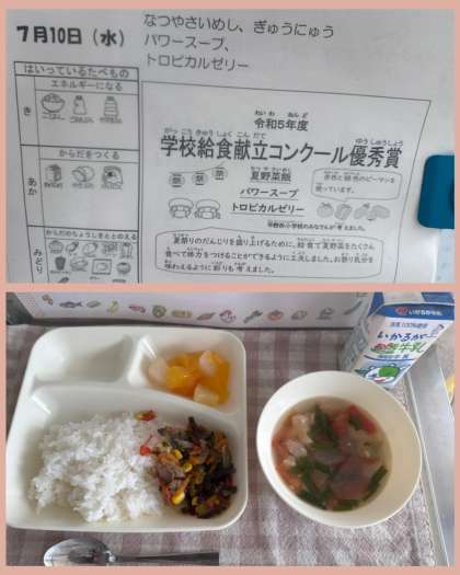今日は令和5年度の学校給食献立コンクールの優秀賞に選ばれた献立です。平野西小学校のみなさんが考えたそうです。