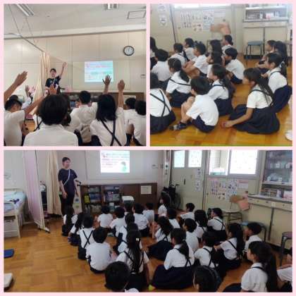 発育測定の前には、保健室の先生が各学年に合わせた内容で保健指導を行っています。短い時間ですが、子どもたちは真剣に話を聞くことができています。