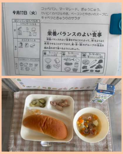今日はベーコンと野菜のスープ煮です。野菜が種類も量もたくさん入っていて栄養満点です。