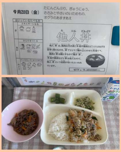 今日は他人丼です。子どもたちに「親子丼と他人丼の違いを知っている人?」と聞くと、鶏肉と卵は親子だから、牛肉や豚肉だと他人になる!と正解できる児童もいました。
