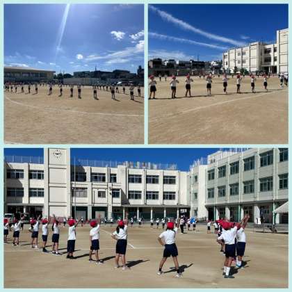 1時間目に2年生が運動場で団体演技の練習をしていました。