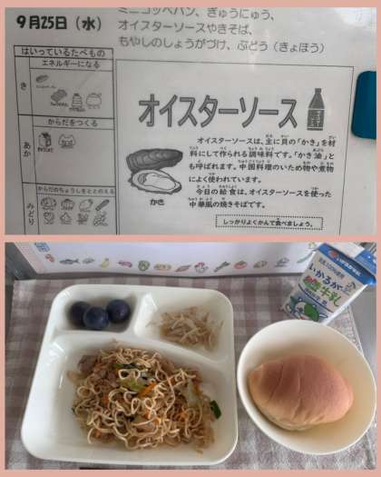 今日は焼きそばです。普段給食では、和風焼きそばが多いですが、今日はオイスターソース焼きそばです。