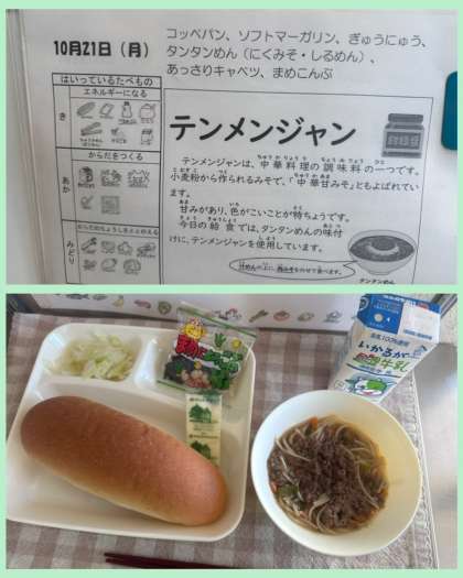 今日はタンタンめんです。タンタンめんといえば辛いイメージがありますが、給食ですので辛くはありません。どちらかといえばテンメンジャンで甘く味付けされていて、子どもにも食べやすくなっています。