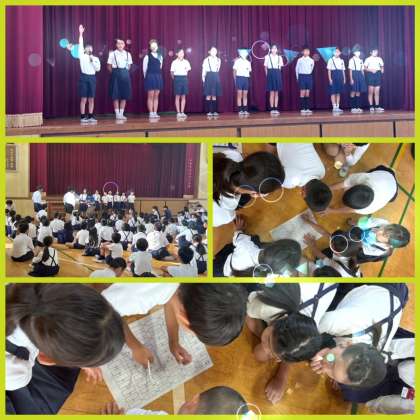 生活集会委員会のゲームはぐるぐるしりとりです。班で円になって一人ずつしりとりになるように紙に言葉を書いていきます。制限時間は4分で、一位の班は30個も言葉をつなげることができました。