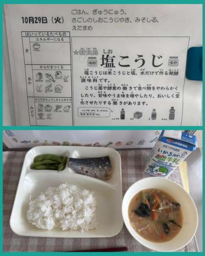 今日はさごしの塩こうじ焼きです。給食でさごしはおろし醤油かけで出ることが多いですが、今日は初めて塩こうじ焼きで登場しました。塩こうじは米こうじと塩、水だけで作る発酵調味料です。