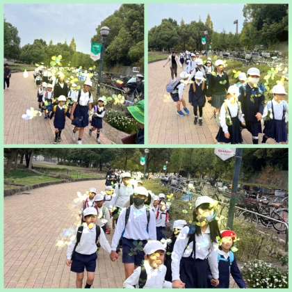 すべての班がゴールしたあとは学年ごとに並び直して帰ります。1年生は6年生のお兄さんお姉さんに手を繋いでもらって安全に帰ります。嬉しそうな1年生と誇らしげな6年生、とても素敵です。