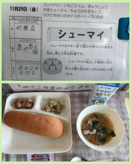 今日は焼きシューマイです。餃子やシューマイなどは好きな子どもが多いようです。
