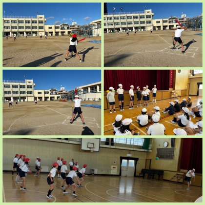 写真は1年生のお楽しみ会と、6年生のドッジボール&ティーベースボール大会の様子です。