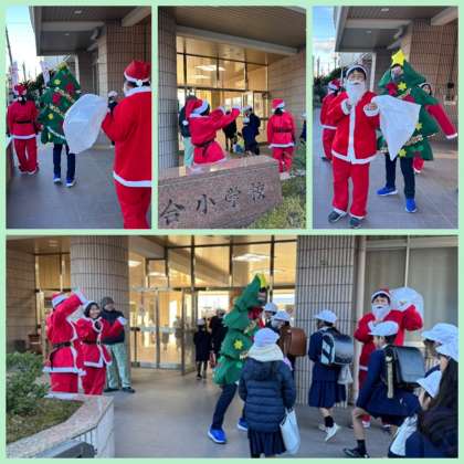 今朝は正門で、サンタクロースやツリーに扮した先生たちがお出迎えです^^