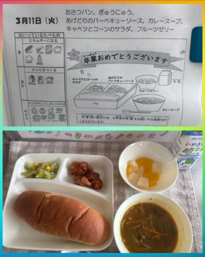 今日は卒業祝い献立です。卒業する6年生をお祝いする気持ちがこめられています^^