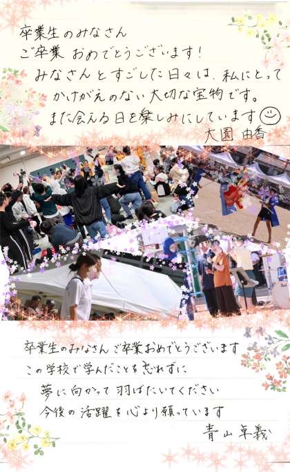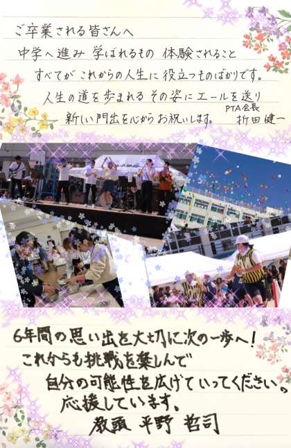 校長先生をはじめ、先生方やPTA会長から心温まるお祝いのメッセージをいただきました。