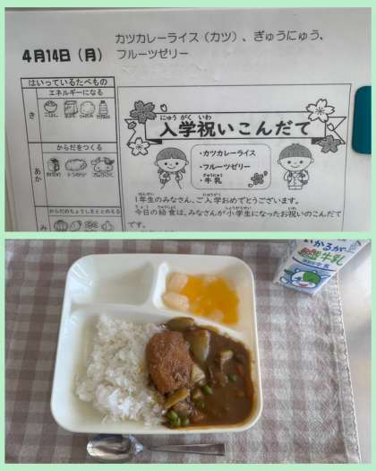 今日は入学祝いこんだてとして、カツカレーライスとフルーツゼリーが登場しました。