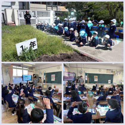 1組は外に出て、野菜や花を育てる学習園や、5年生が稲を育てる田んぼなどを実際に見て説明してもらっていました。まだ学校には知らない場所がたくさんあると思うので、少しずつ覚えていってくださいね。
