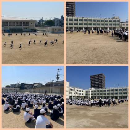 非常ベルがなるとそれぞれが身を低くして頭を守ります。揺れが収まったタイミングで運動場へ素早く非難します。「お・は・し・も」を守りながら避難することができました。