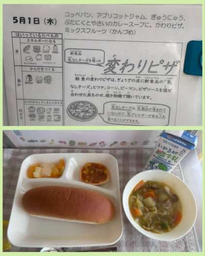 今日は変わりピザです。餃子の皮にピザソースやチーズ野菜などをのせて焼いてある一口サイズのピザですが、これが子どもたちには大人気です。