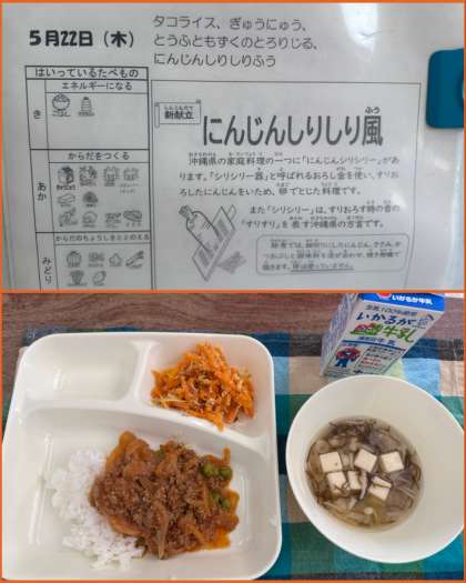 今日は沖縄料理が給食に登場しました。にんじんしりしりにタコライス、もずくも沖縄県でたくさんとれる海藻です。