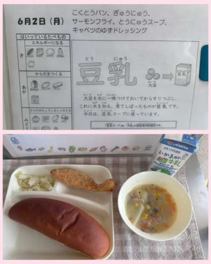 今日は豆乳スープです。大豆からできている豆乳は栄養もあり、スープにするとクリーミーで美味しいです。サーモンフライもカラッと揚がっていてとても美味しかったです。