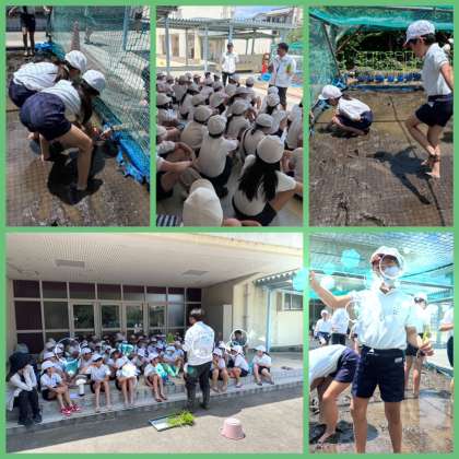 お米にまつわるお話を聞いたあと、田植えの仕方を教えていただき、みんなで行いました。