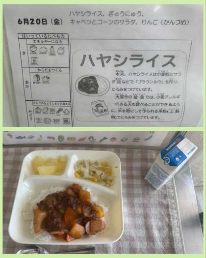 今日はハヤシライスです。ハヤシライスというと玉ねぎと牛肉のイメージですが、給食のハヤシライスではじゃがいも、にんじん、マッシュルームも入っていてとても具沢山です。