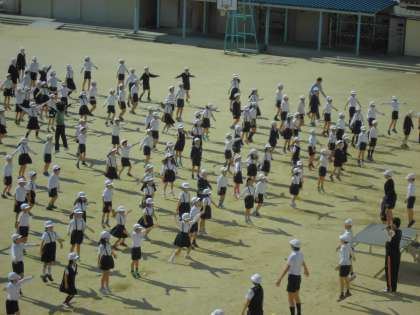清々しい青空の下、全校児童がラジオ体操をしました。1年生は小学校では初めての体験で、他学年は久しぶりということもあり、少々ぎこちなかった感じがしました。