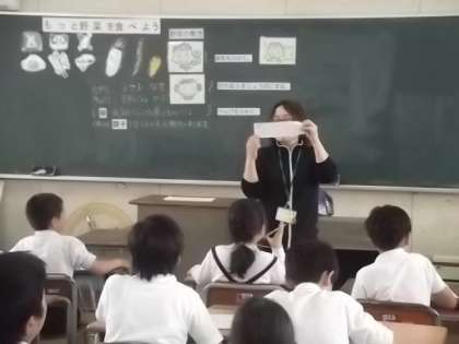 「野菜をもっと食べよう」のテーマで、野菜の働きについて学習しました。グループごとに給食で食べている野菜の量を調べ、1日に必要な野菜の量を知りました。