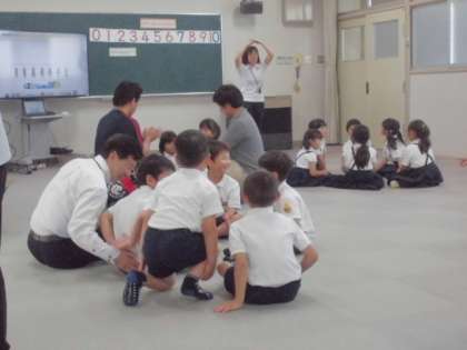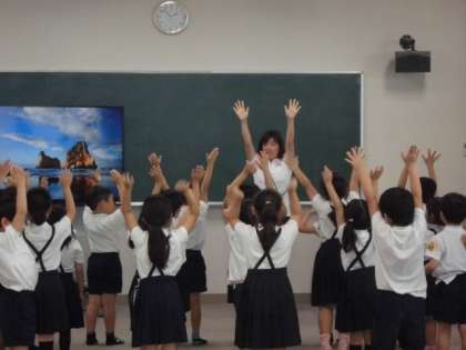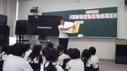 本校では、今年度から英語活動の研究に取り組んでおり、今回は、第1回目として、1年1組久野学級が多目的室で授業をしました。
