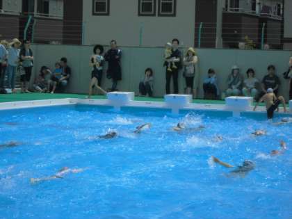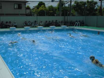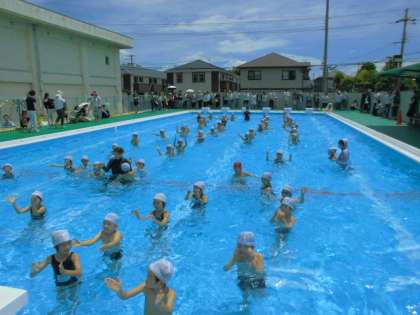 梅雨の晴れ間、照りつける太陽の下で、子どもたちは、歓声をあげながら楽しく水泳学習をしていました。