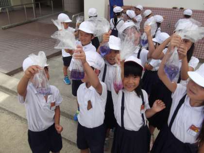 入れた花びらによって水の色が変わるので、友達と見せ合いっこしあう姿も…。