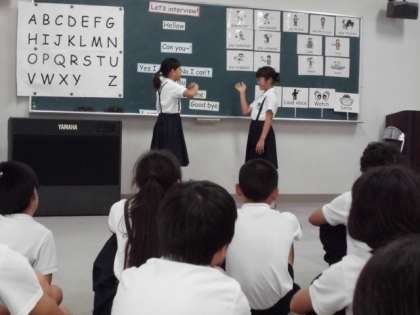 C-NETのアネット先生の発音を復唱し、6年の先生方のモデルを聞いた後、楽しくインタビューし合い、活動できました。