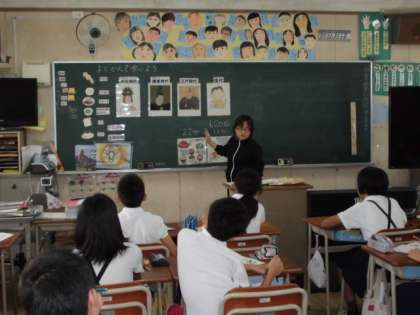 テーマは「よくかんで食べよう」。日本の各時代ごとの食事時間と噛む回数、食べ物の違いを抑えてから、よくかむ8大効用「ひみこのはがいーぜ」について学習しました。