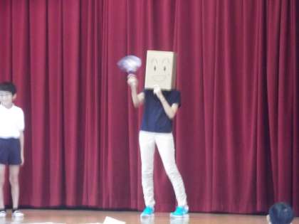 段ボールマスクをかぶった先生が舞台上に登場し、服装や動きなどをヒントにどの先生かをあてるゲームです。