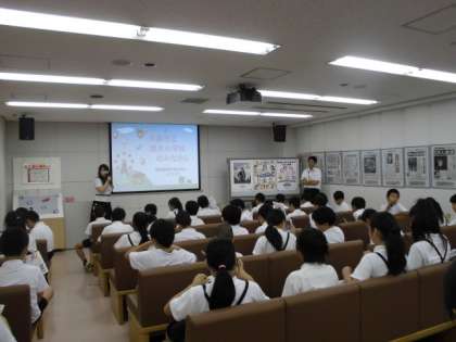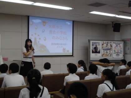 まず2階の学習ルームで全体説明を聞きました。学級ごとに記念撮影もしていただきました。