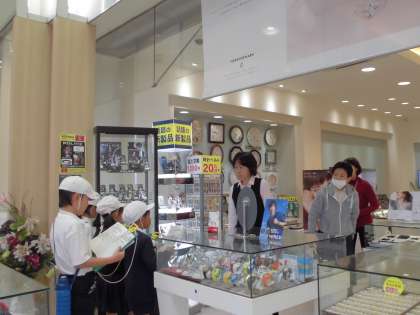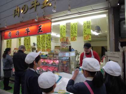 「鷹合小学校から学習に来ています。ご協力ください。」と、商店街の中に放送を流していただきました。
