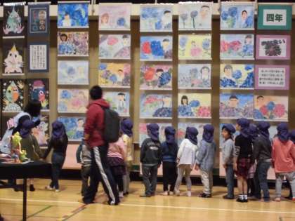 今回は作品展を、4歳児5歳児の80名ほどが見学しました。皆さん、静かにマナーを守って観賞していました。あちこちから、「きれい!」「すごい!」等の感想も聞こえ、和やかなひと時を過ごしてもらえました。