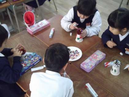 生活科で「秋」の学習をしたときの「まつぼっくり」を使って工作をしました。