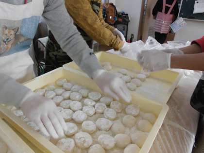 つきあがったおもちは、手早く丸められ、袋詰めされていきました。