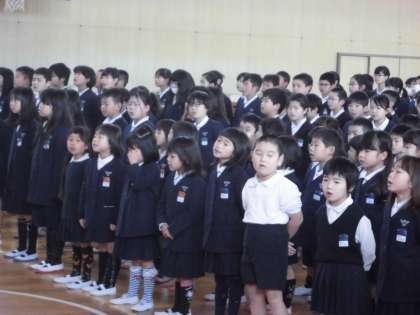 子どもたちは、今学期「早寝、早起き、朝ごはん(生活のリズム)」「気持ち良いあいさつを心がけよう」「廊下、階段を歩こう」という3つの目標の下で学校生活を送っていくことを確認した後、元気いっぱい校歌を歌いました。