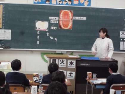 歯科衛生士の方が講師として、奥歯(第一大臼歯)の大切さや物の食べ方、歯の磨き方について、丁寧に教えてくださいました。