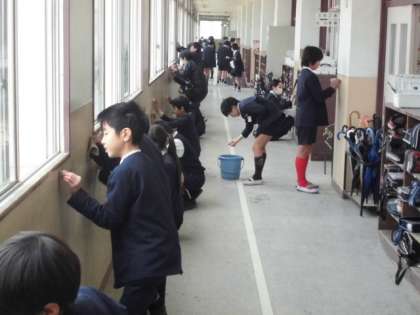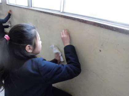 今回は、5年生が北校舎3階を掃除しました。普段はあまり磨くことのない廊下の壁を子どもたちはケミカルスポンジを使って懸命に磨いていました。磨いた後は、汚れがくっきりと落ちて、とてもきれいになりました。