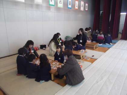 コマ回し、折り紙、カルタ、マリつき、けん玉など昔遊びを通して地域の方とふれあうことができました。最初のあいさつでも言いましたが、この中から将来、○○の名人が出たらすごいですね。