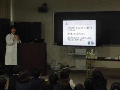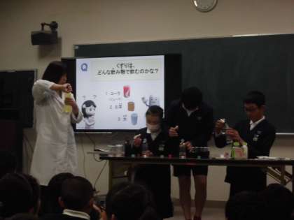学校薬剤師先生にお越しいただき、薬についての正しい知識や飲むときの約束などを実験を交えながら説明していただきました。また、薬物乱用の恐ろしさやたばこが引き起こす害についてもお話しされました。