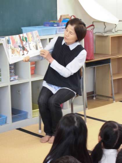今朝の読書タイムには、入学して初めて1年生が和室で絵本を読んでいただきました。みんなお話の世界に入りこみ、聞き入っていました。