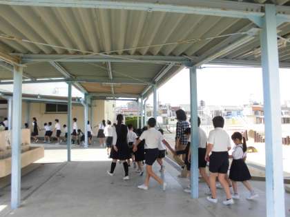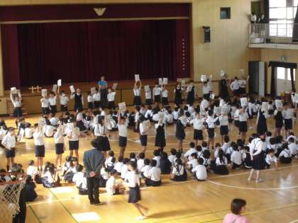 今日の児童集会では、月曜日のたてわり班編成を受けて、初めてたてわり班で並ぶ練習をしました。まず、今回も6年生が1年生を迎えに行き講堂まで連れて行ってくれました。やさしいお兄さんやお姉さんに手をつないでもらって、1年生は、安心して講堂に向かいました。講堂では、たてわり班のリーダーの6年生が班カードを掲げて、2年生から5年生が集まりやすいようにしてくれました。